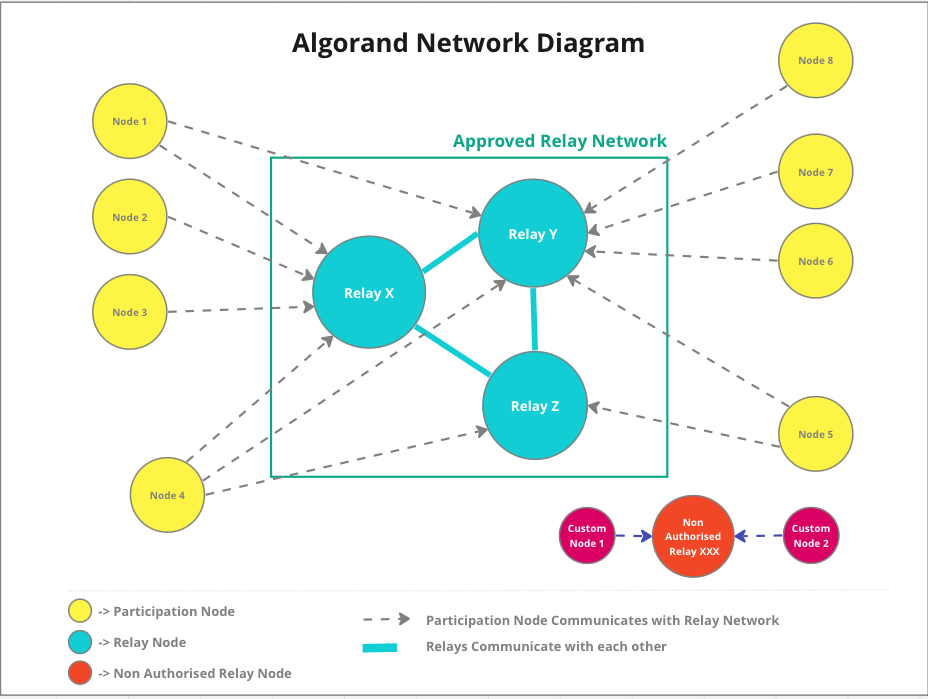 Star Topology: As depicted in Diagram 1, Algorand employs a star topology where each Participation Node connects to one or several Relay Nodes. Relay Nodes also interconnect, forming a robust mesh for data routing.