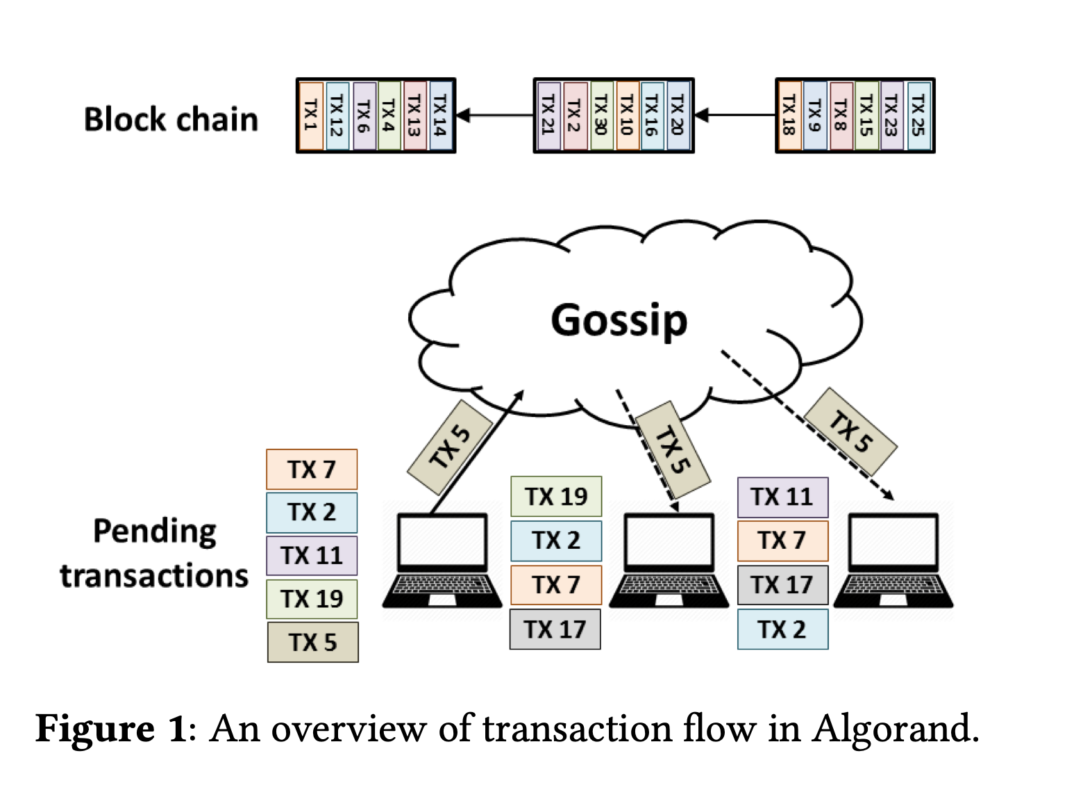 A great example is the original prototype of Algorand that used a Gossip protocol similar to Bitcoin, as we can see illustrated on this figure from the original white paper:
